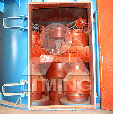 工作时,将需要粉碎的物料从机罩壳侧面的进料斗加入机内,依靠悬挂在主机梅花架上的磨辊装置,绕着垂直轴线公转,同时本身自转,由于旋转时离心力的作用,磨辊向外摆动,紧压于磨环,使铲刀铲起物料送到磨辊与磨环之间,因磨辊的滚动碾压而达到粉碎物料的目的。
