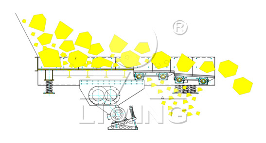 TSW给料机采用惯性式双偏心轴激振器能产生定向激振力。两轴之间有一对传动比为1的齿轮副连接,保障其回转方向相反,转速相等。通过电动机驱动,两偏心轴旋转,由于两轴上的偏心质量和偏心距大小相等,所产生的惯性力在一个方向互相抵消,而在另一个方向互相叠加,从而合成的定向激振力,使与此激振器刚性连接的给料槽体在支承弹簧上做强制振动,物料在振动力的作用下,在料槽上作滑动及抛掷运动,从而使物料前移而达到给料目的。当物料通过槽体上的蓖条时,较小的物料通过蓖条之间的间隙落下,不再经过破碎而直接进入下道破碎工序,从而起到预筛分效果,充分保障破碎设备的破碎效率及能力。